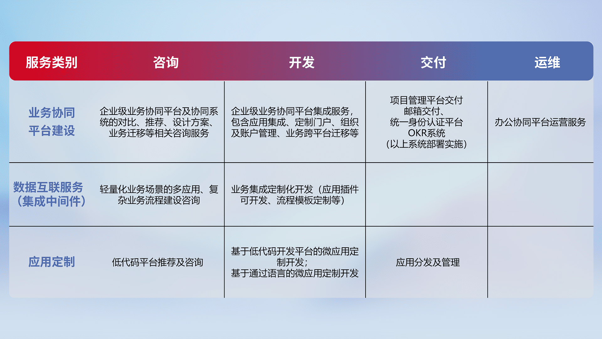 针对钉钉、、、企微、、、IDaas等平台级产品提供产品的规划、、、、方案、、交付、、、、定制化开发等服务,,实现如统一协同办公、、、、智能客户服务、、、、混合会议管理、、、、智能数据查询、、、、等业务场景,,,,实现数字化转型。。